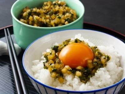 九州ならではの甘めの味付けの漬け物と卵が合う!1度食べたらやみつき間違いなし!!もちろん卵かけご飯だけでなくご飯に混ぜておにぎりにしたり、納豆に混ぜても合いますよ。