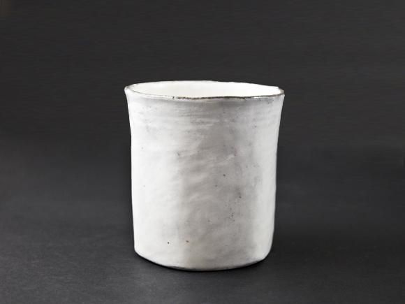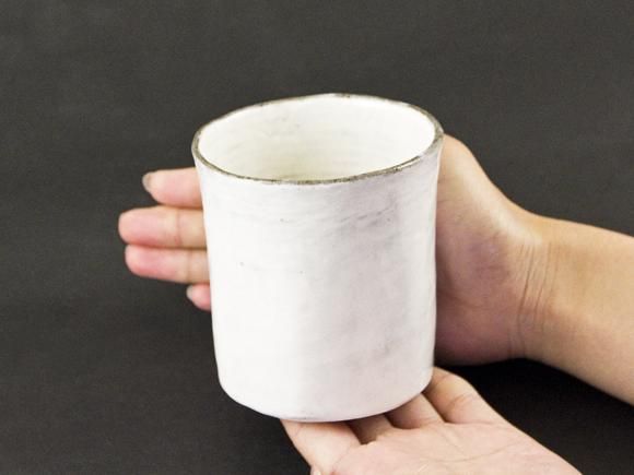 表面は白い化粧土をハケで塗り重ねて仕上げた『ロックカップ』です。