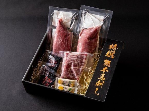 お土産や贈り物に喜ばれる馬刺しの定番セットをご用意しました。タレ・おろし生姜付きのセットなので、カットしてすぐにお召し上がりいただけます。