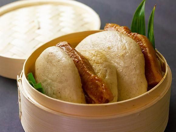 じっくりと煮込んだ柔らか豚角煮をそば粉入りのまんじゅうに挟んだ『豚角煮そばまんじゅう』。