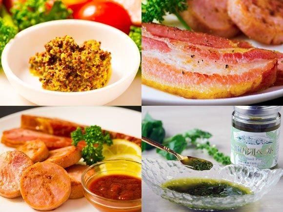 ベーコン:豚ばら肉、食塩、砂糖、香辛料/調味料(アミノ酸等)、酸化防止剤(V.C)、リン酸塩(Na)、発色剤(亜硝酸Na)