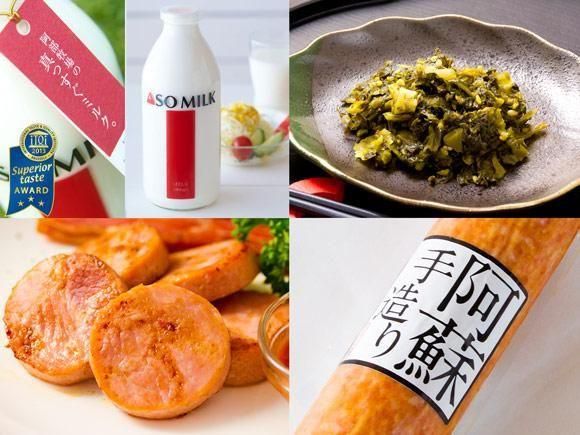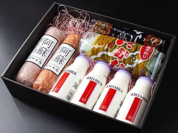 大人気の手作りハム・ポークソーセージに阿蘇特産たかな漬けや「阿部牧場」のおいしい牛乳を盛り込んだセットです。