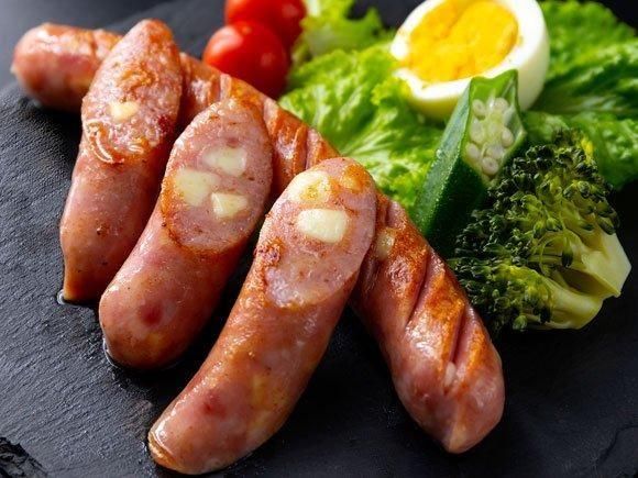 チーズフランクフルト:豚肉、チーズ、食塩、砂糖、香辛料/酸化防止剤(V.C)、リン酸塩(Na)、発色剤(亜硝酸Na)