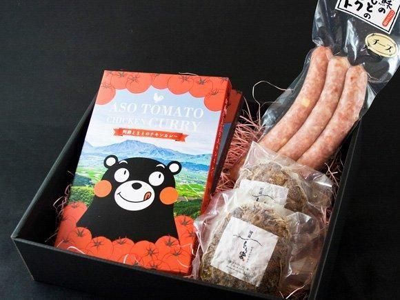 阿蘇神社の横参道にあたる門前町商店街の人気店「阿蘇とり宮」の『手づくり赤牛ハンバーグ』と「阿蘇はなびし」の『阿蘇とまとのチキンカレー』、阿蘇の豊かな湧水と天然塩、オリジナルスパイスで作る「ひばり工房」から『チーズフランクフルト』をセットにしました。