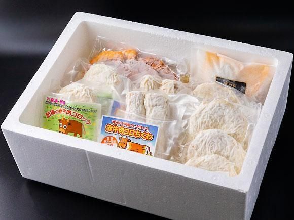 赤牛ちくわコロッケ:じゃが芋・玉ネギ・あか牛肉・ちくわ魚肉・パン粉・塩コショウ・酒、醤油/(アルコール)、調味料(アミノ酸等)、甘味料(甘草、ステビア)(原材料の一部に小麦、牛肉、大豆を含む)