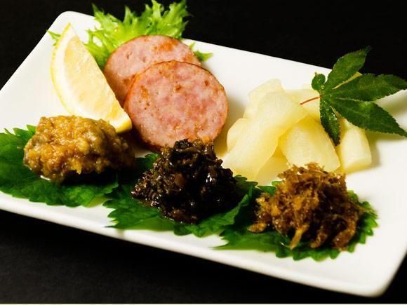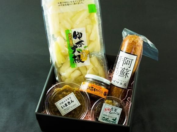 ご飯やお酒がすすむ逸品を詰め合わせました。あか牛丼で有名ないまきん食堂の「あか牛味噌」に乙姫の森のレストランで人気のピリ辛「手作り高菜らぁー油」。ほっとする味の「生姜の佃煮」。やさしい柚子の香りの「ゆず大根」。それにパンチの効いた「ポークソーセージ」のセットです。