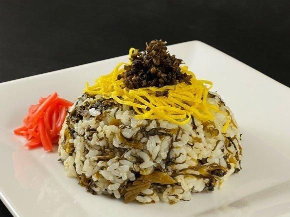 阿蘇高菜飯の素:阿蘇たかな、生姜、しその実、漬け原材料(醤油、砂糖、植物油、食塩、食酢、唐辛子)、調味料(アミノ酸等)、ソルビット、酸味料、保存料(ソルビン酸K)、着色料(ウコン、赤102)、(原材料の一部に小麦、大豆を含む)