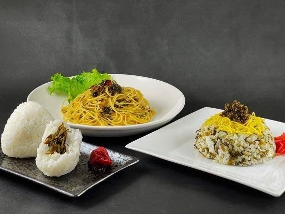 高菜油炒め(まろやか高菜):高菜、食塩、食用植物油、アミノ酸液、ごま、唐辛子、アミノ酸液、着色料(ウコン)