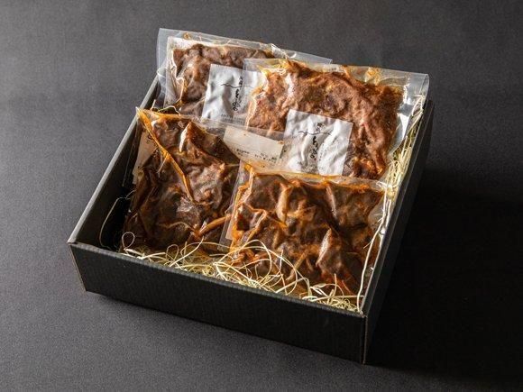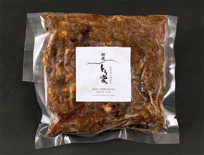 【馬スジの煮込み】馬のスジをじっくり、じっくり、甘辛く煮込みました。袋に入ったまま湯煎で約10分温めて、そのまま食べて良し。佃煮のように温かいご飯の上にのせ、その上に卵をのせて食べてもおいしくいただけます。