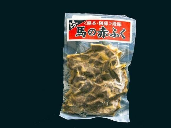 馬の赤ふく:馬肺、サラダ油、生姜、酒、みりん、唐辛子、豆板醤、醤油/アルコール、調味料(アミノ酸等)、甘味料(甘草、ステビア)、(原材料の一部に小麦、大豆を含む)