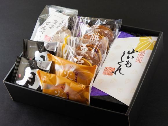 生姜がきいた「生姜せんべい」。山芋と小豆をしっかり練って焼いた、あんこ好きにはたまらない「山いもしぐれ」。どら焼き2種類に、宮内庁へのお土産品として選ばれたことのある阿蘇の野焼きをイメージしたお餅と粒あんの「火文字焼き」。阿蘇小国ジャージミルクの練乳と濃厚なチョコレートで作った洋風饅頭の「しん月」ボリュームたっぷりのセットです。