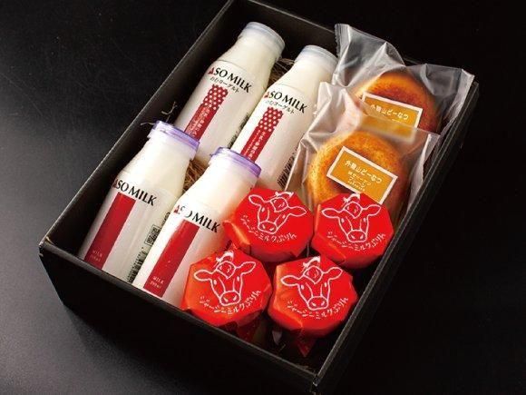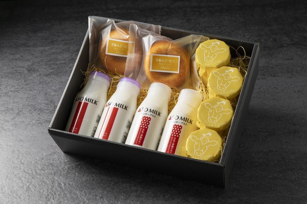 人気の阿蘇の牛乳をたっぷり使ったスイーツセット。阿部牧場の「ASOMILK」と「のむヨーグルト」は飲み切りサイズ。ASOMILKをたっぷり使って作った「阿蘇ミルクチーズプリン」。揚げていない優しい味の「外輪ドーナツ」の詰め合わせです。阿蘇の美味しい牛乳とスイーツをお楽しみください。