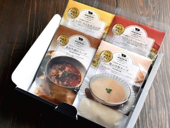 とろとろの食感がたまらないじゃがいもと玄米のスープなど、ほこすぎ特製のスープ4種セットです。