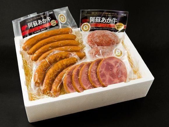 - 阿蘇あか牛ハンバーグ(110g×3個)×1袋、阿蘇あか牛ペッパーフランクソーセージ約175g、阿蘇あか牛ウインナーソーセージ約175g、阿蘇あか牛ブロック肉入りハムステーキ約200g