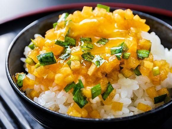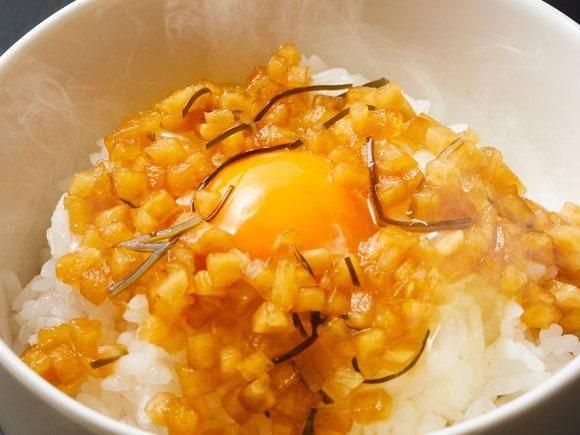 刻んだ大根のしょうゆ漬けとたっぷりの漬け汁で卵かけご飯に、食感・うま味・ヘルシーをプラス。九州ならではの甘めの味付けの漬け物と卵が合う!